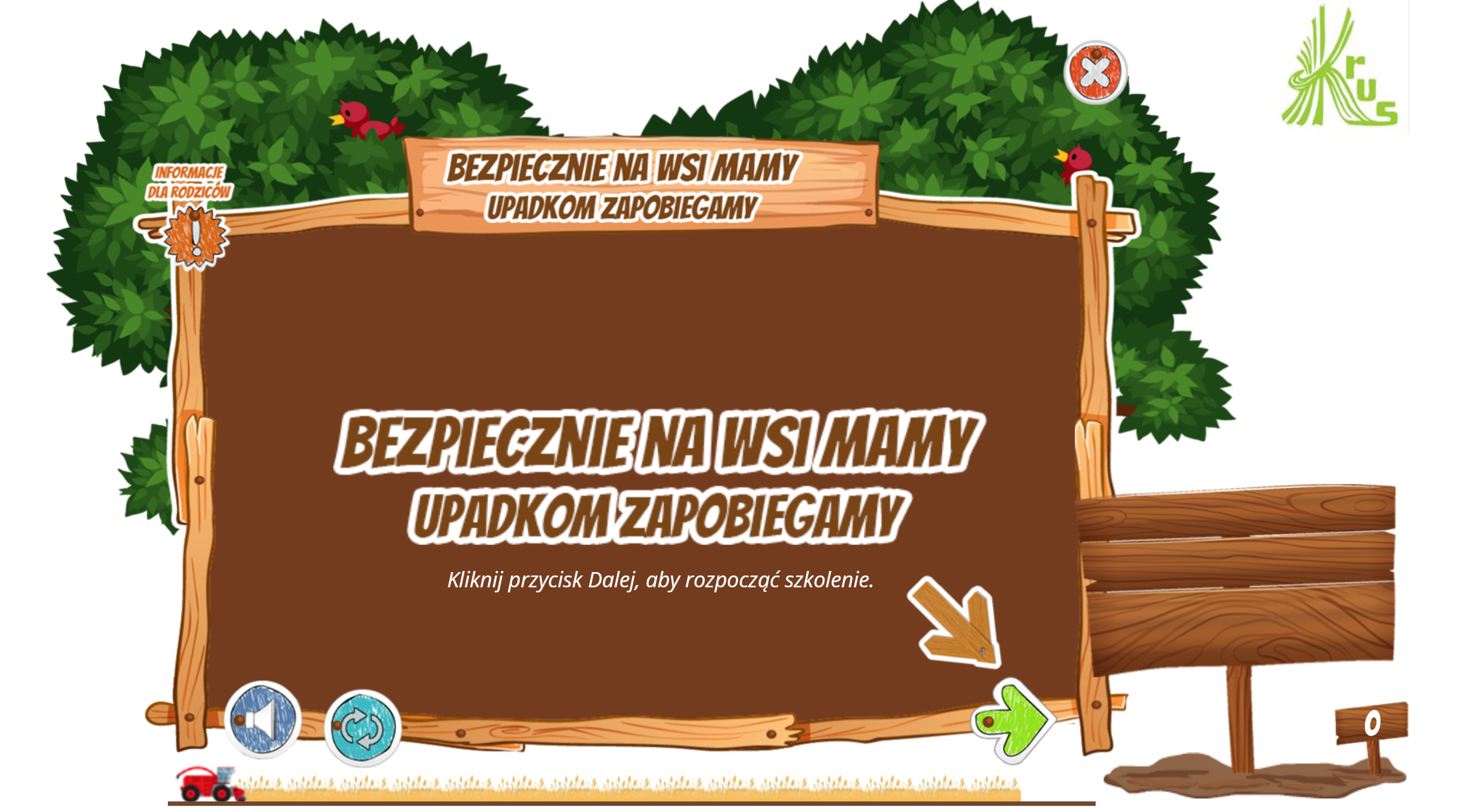 2. Szkolenie e-learningowe dla dzieci „Bezpiecznie na wsi mamy – upadkom zapobiegamy”, w którym wraz z trojgiem sympatycznych dzieci poznasz najczęściej występujące w gospodarstwach sytuacje niebezpieczne: